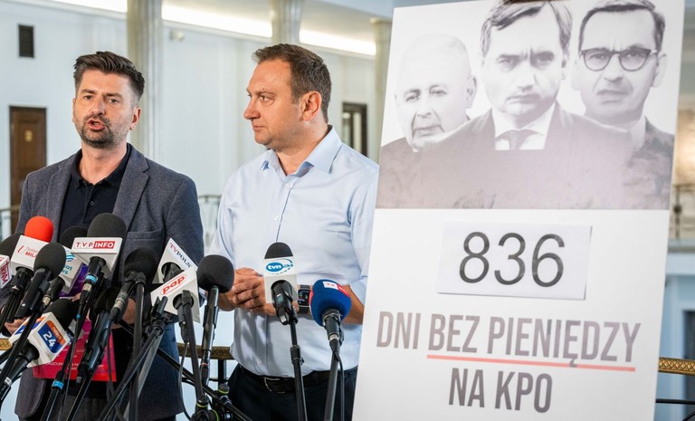 W Sejmie było dziś gorąco. Podczas wystąpienia premiera posłowie Lewicy Tomasz Trela oraz Krzysztof Śmiszek wywiesili transparent z napisem „834 dni bez pieniędzy z KPO”. Po ...