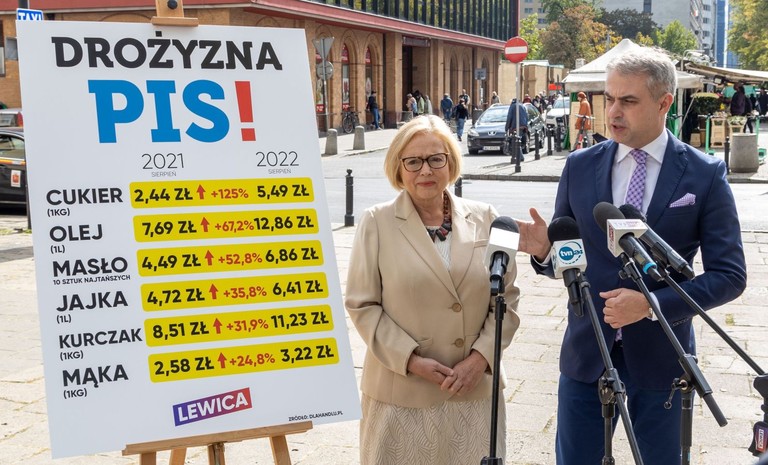 Dane GUS mówią o 16 procentowej inflacji w Polsce, ale prawdę widać przy kasie, produkty żywnościowe są droższe o kilkadziesiąt procent. Lewica spod Hali Mirowskiej w Warszawie ...